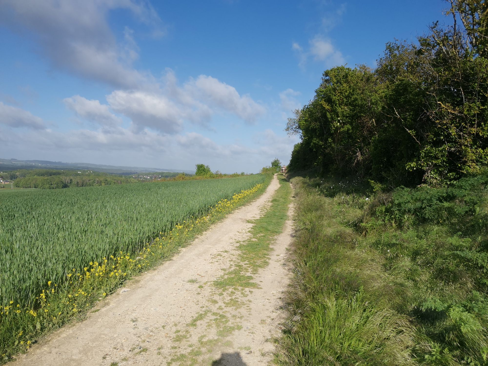 En route direction Toutainville. Une étape agréable avec pas mal de chemins, une première partie assez plate et la deuxième avec un peu plus de relief. Le soleil était au rendez-vous, par contre beaucoup de vent.